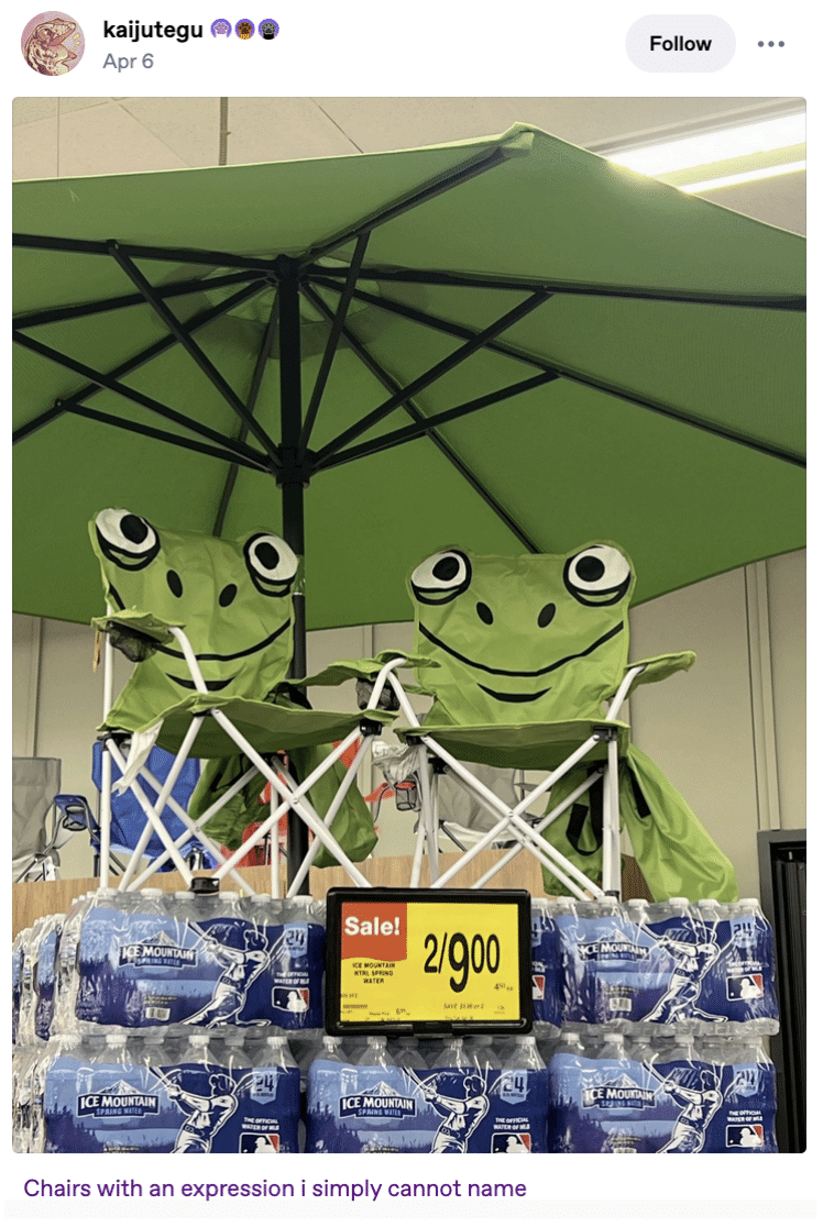 Okay, to be honest, my favourite thing about this post is not the post itself. It’s actually a text my friend sent me, which consisted of this image of the frog chairs along with the words “me when i try smiling at work”. While my job now has me smiling more often than I thought was possible, I famously worked as a barista for three years, and when I tell you those facial expressions were forced… well. Me when I try smiling at work.