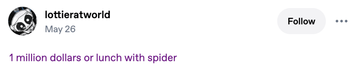 Short and sweet. Makes you think. I would pick lunch with spider, because I have no idea what I would do with 1 million dollars.