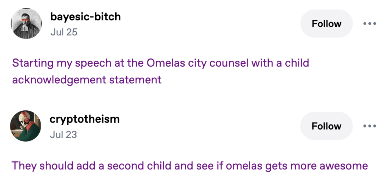 So this is also a genre of post, but it’s so bizarrely specific that I wanted to include it. If you haven’t read Ursula K. Le Guin’s The Ones Who Walk Away From Omelas, I can’t recommend it enough. Not only is it fantastically written, it’s also a perfect allegory for many of the issues we face in society today. Also, you will understand the two posts above. The thing I appreciate about the top post is that it is both a cutting satire of the current state of Canada’s reconciliation practices, and also the phrase “child acknowledgement statement” is hilarious. The second post is just a thinker.