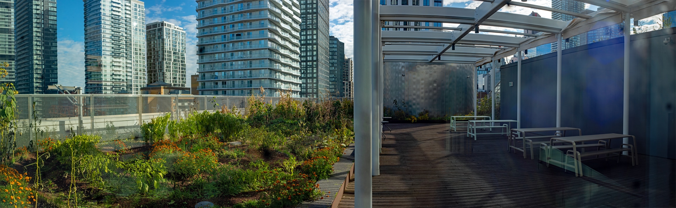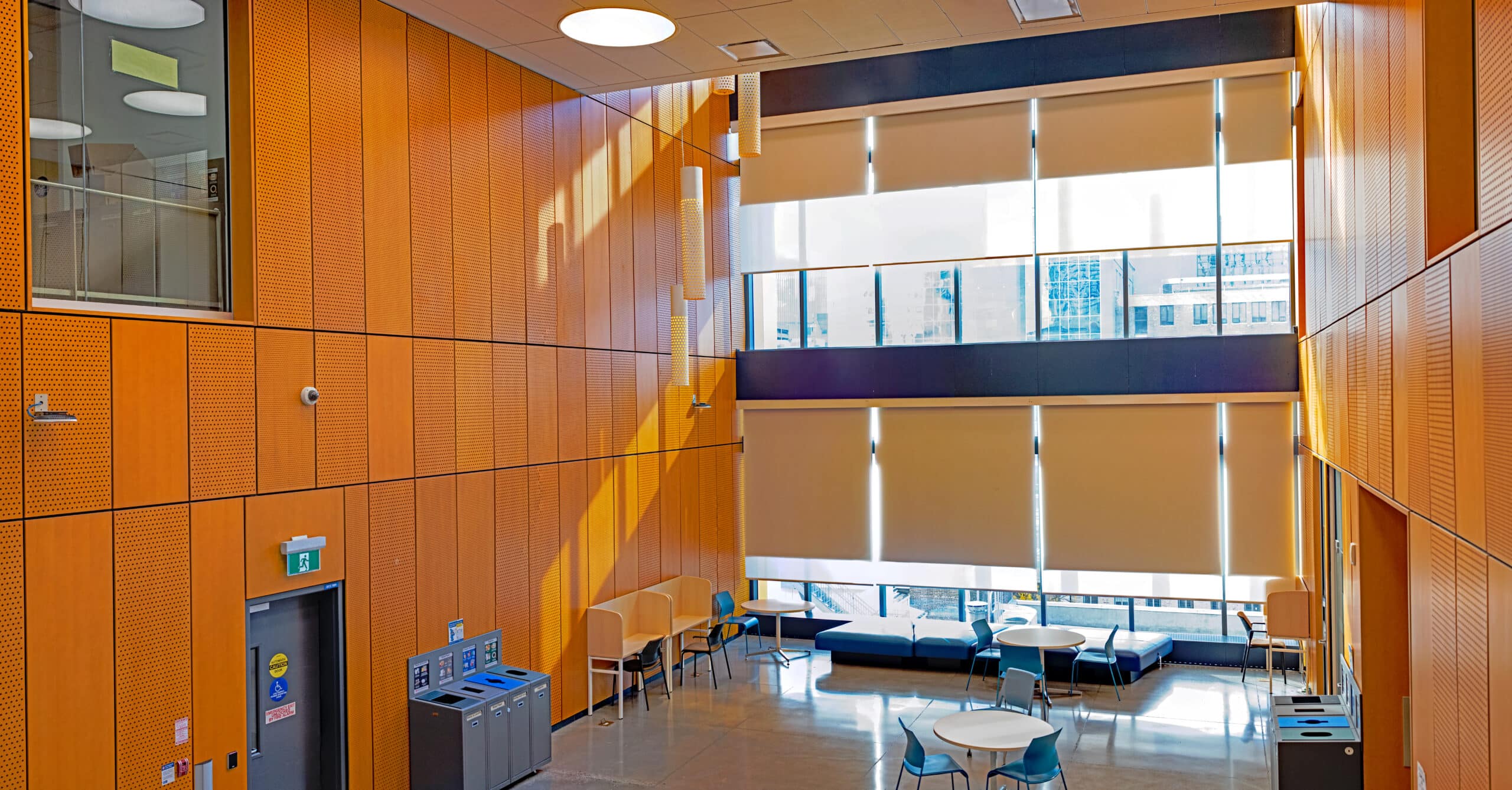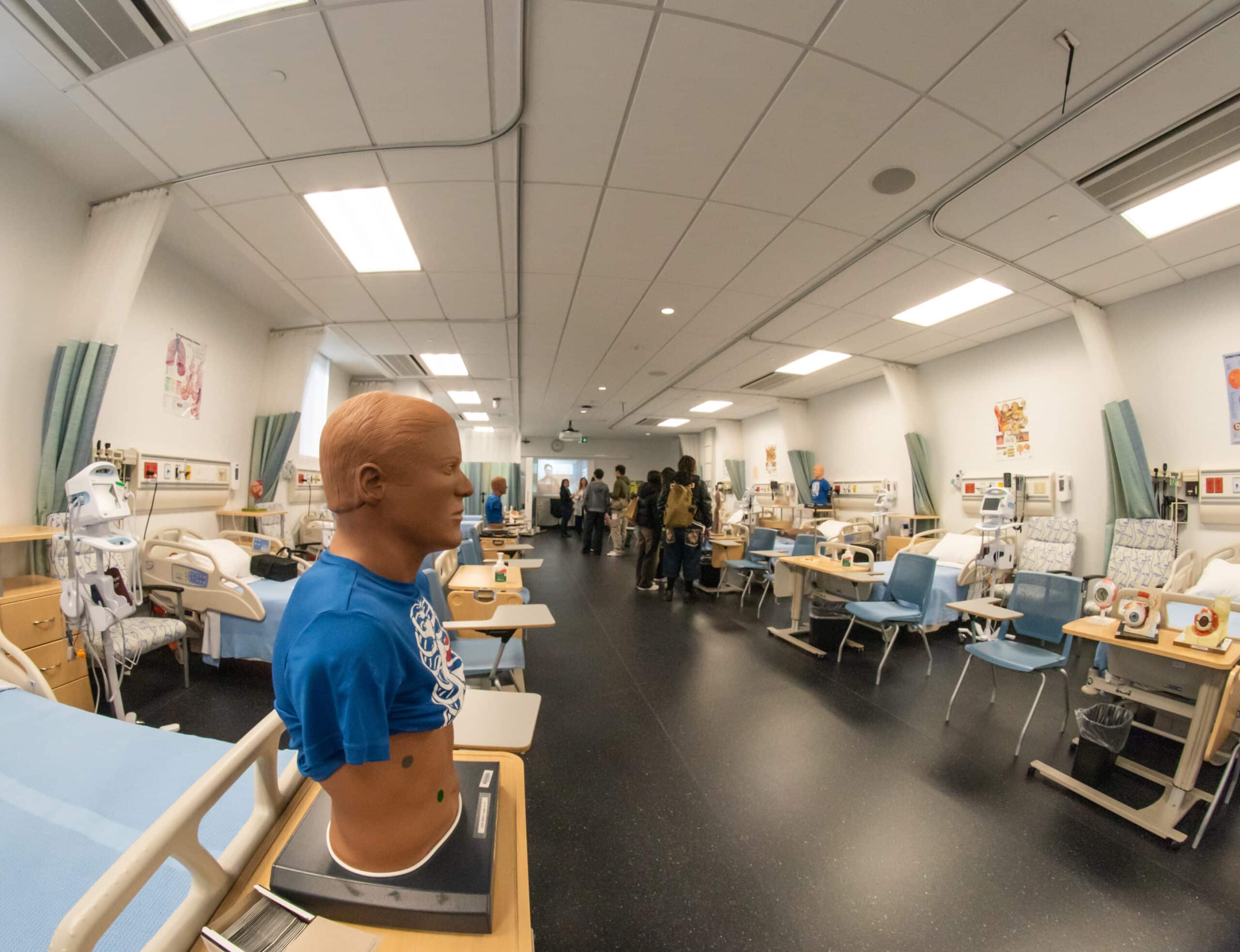 Across the street is the Daphne Cockwell Health Science Complex. It is as tall as the engineering building! The first eight floors are filled with offices and lecture spaces, and a fully equipped simulation lab for its nursing students. The additional nine floors above are student residence dormitory rooms, as well as a rooftop garden.