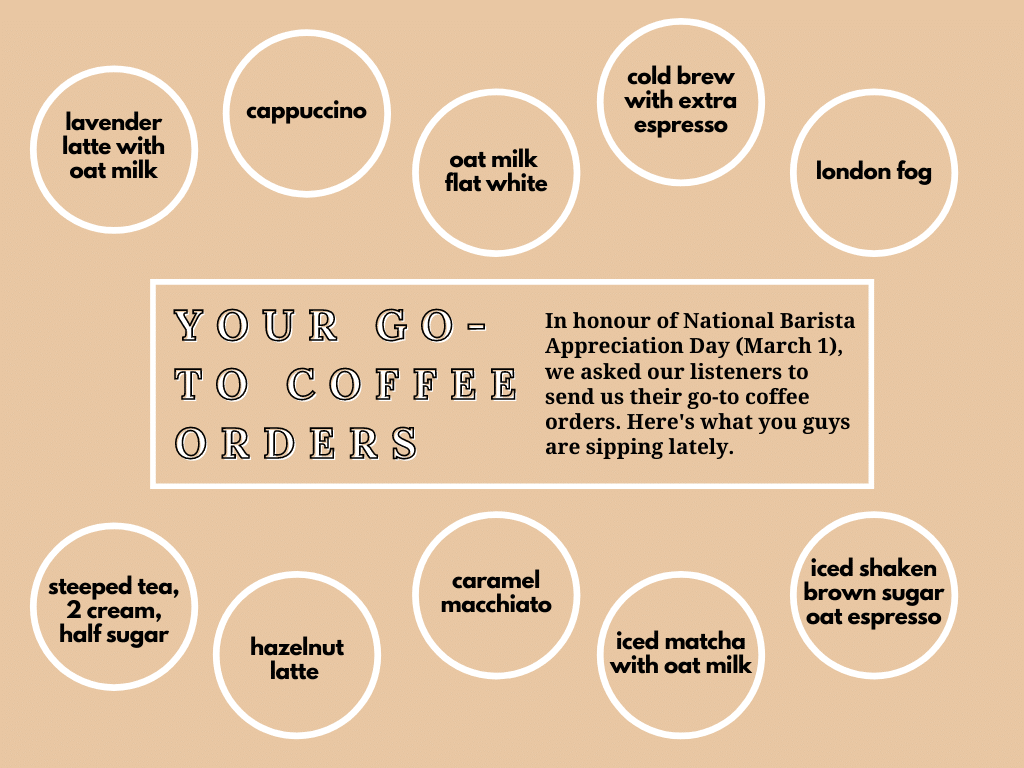 In honour of National Barista Appreciation Day (March 1), we asked our listeners to send us their favourite coffee/tea orders, cafés and spots on campus, and what they like to listen to while sipping their preferred beverage. Tip your baristas today, and enjoy!