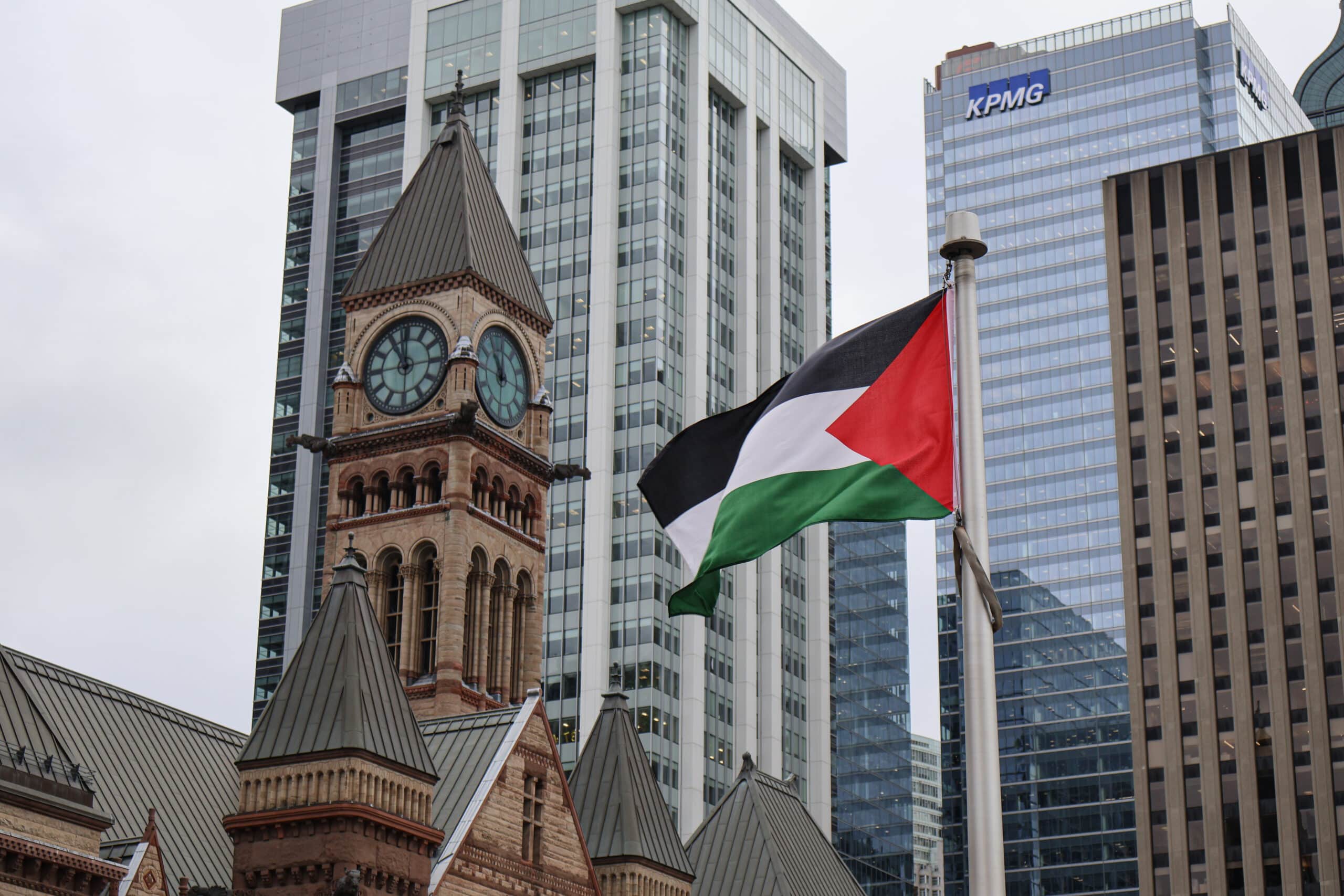The Palestinian flag flew over Toronto city hall on Monday morning for the first time ever, an unprecedented moment nearly halted by a last-minute court challenge. While several hundred people gathered in celebration to witness the historic event, lawyers for the International Centre of Justice for Palestinians (ICJP) and the city of Toronto were in court defending against an injunction…