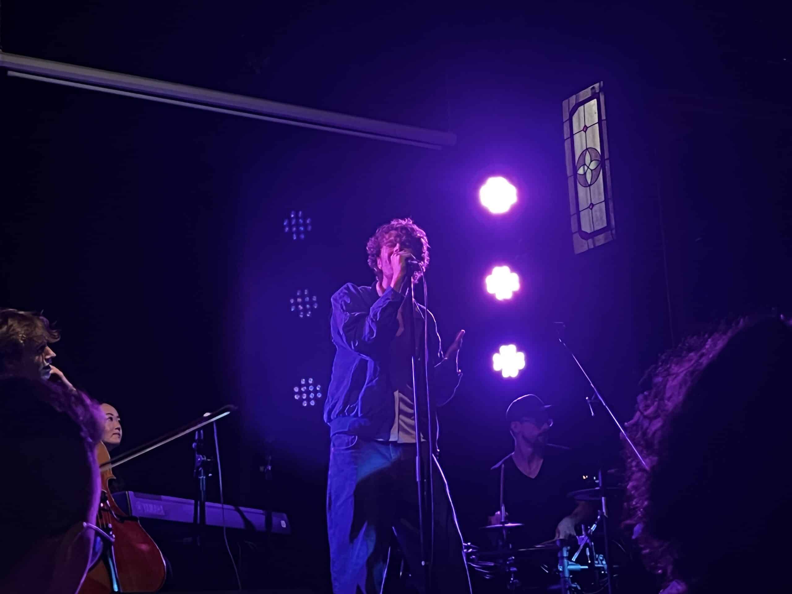 Fresh-faced Alekxandr hops onstage, pink shirt parted and curly locks flowing freely across his face. Accompanying him onstage is cellist Will Smythe, drummer David Xanders, and Danielle Sum (from local band Tiger Balme) on piano and glockenspiel. Bar Cathedral’s wooden interior and ornate stained glass windows set the scene beautifully for the night’s performers.