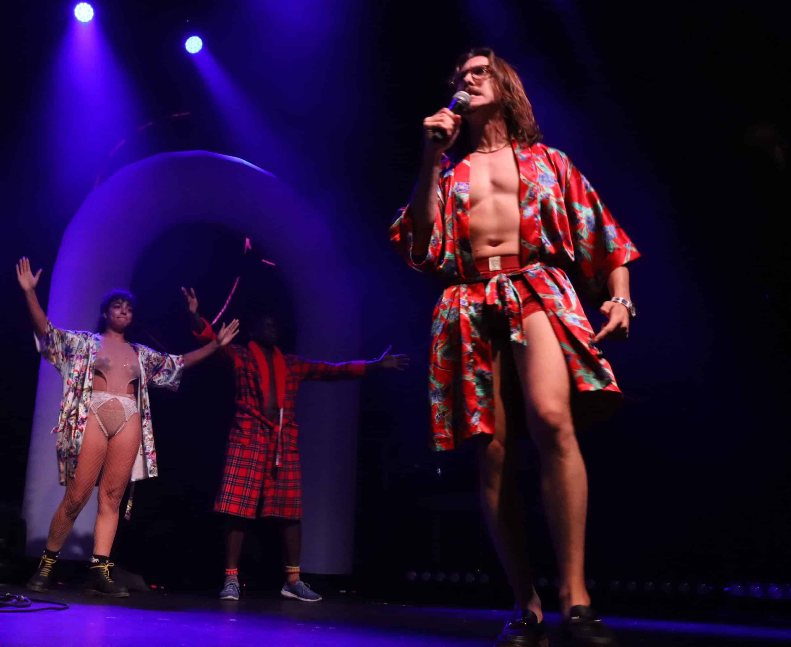 The opening DJ, The Kount, had a traditional yet crowd-pleasing DJ set with an Outcast-heavy rotation. Just before 7 p.m, Rebillet, sprang on stage in brown loafers, red boxer briefs, a floral patterned silk robe, and his signature glasses. He darted from one end of the stage to the other strutting and posturing, soaking in the hollering from the crowd. He then positioned himself behind his keyboard, plug-in mic, computer, and loop station, and step-by-step began to compose a bass and foghorn heavy track with lyrics like, “It’s 7 pm and we’re in the motherf*cking club.” With a lingering bass loop going, Rebillet stepped down from the stage for some hands-on crowd work, where he was asking around for people who had showered before coming to the show. He brought up two audience members on stage – one who had a shower before coming, and another who impressed Rebillet with his answer that they are “never clean, always dirty.” They danced on stage for Rebillet’s new set of loops, and quickly they were twerking side by side in their robes, which inspired the simple theme of Rebillet’s emerging song—butts.