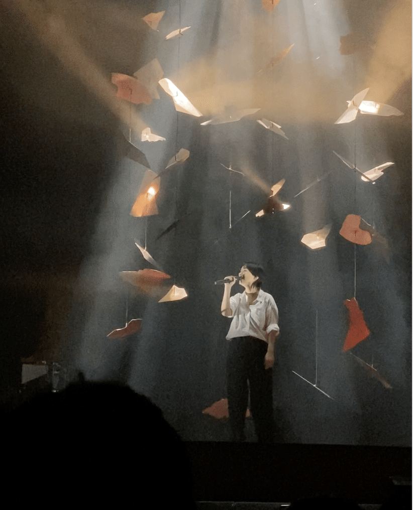 The show opened with a folk version of “Everyone” and Mitski being followed by a spotlight—one of the show’s recurring themes—creating a massive shadow of herself behind a cylindrical curtain before it falls to the ground. What’s immediately evident is how exceptional her band is; a slew of instruments, each played with palpable, intentional articulation. They laughed and had fun amongst each other at the right moments and played with sincerity when need be. My only disappointment is that they were never formally introduced.