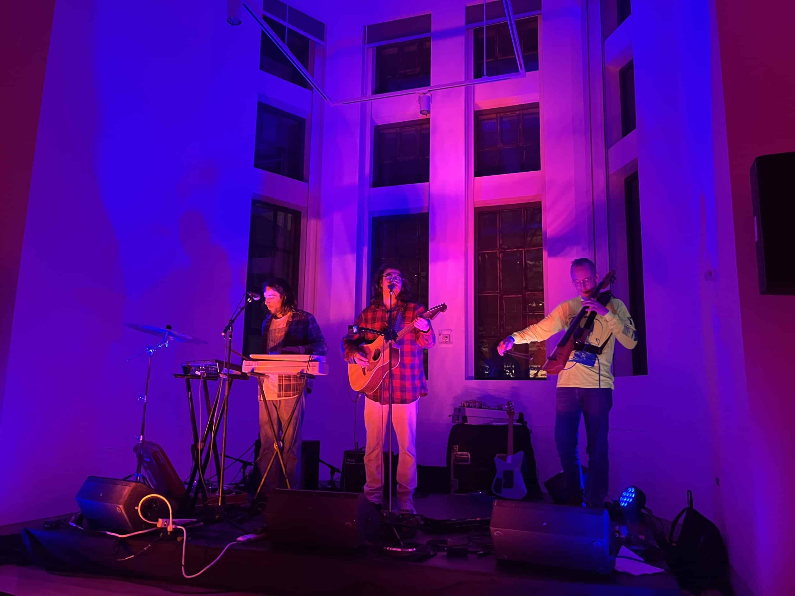 Away from the bustling main hall of the museum, soothing shoegaze-esque melodies radiated through the halls. The music was coming from Zoon – a moniker for Daniel Monkman, an Anishinaabe shoegaze artist. Tucked away in the dimly lit Philosopher’s Gallery, Monkman stood on a small stage grasping their guitar. Though they were only accompanied by two other musicians, the sound that they produced was large and other-worldly – with the sound of their infectious tracks quickly filling out the room. As moving pictures were projected onto the walls of the room, Zoon’s dream-like compositions created an incredible atmosphere.